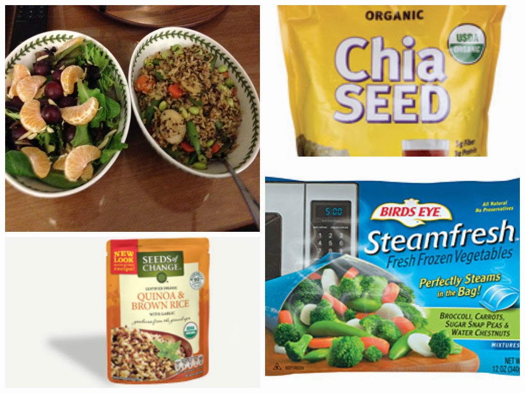 The first thing I add is a bag of brown rice and quinoa by Seeds of Change. They are easy to keep on hand and organic. The rice simply needs to be heated up.